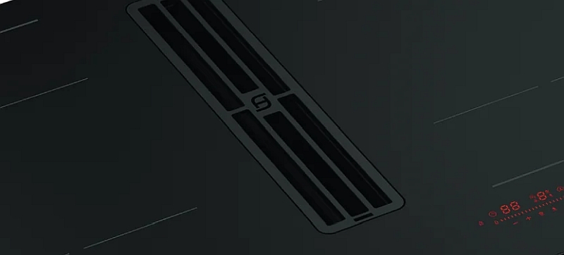 STEROWANIE SUWAKOWE GHOST - intuicyjny w użyciu, ukryty panel sterowania z podświetlonymi na czerwono cyframi pojawia się tylko wtedy, gdy jest potrzebny. Sterowanie suwakiem pozwala na wygodną i intuicyjną regulację stref gotowania oraz poziomu zasysania oparów jednym ruchem.
