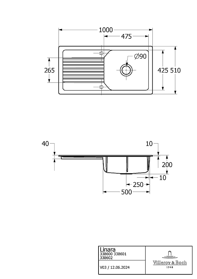 - Na indywidualne zamówienie, za dopłatą, dostępna jest także wersja na równi z blatem: Linara 60 FLAT . Zewnętrzna krawędź zlewozmywaka jest wtedy frezowana pionowo, prostopadle do powierzchni blatu. Zlewozmywak w wersji FLAT z manualnym zestawem odpływowym posiada nr kat.: 3386 1F R7, natomiast model z automatycznym zestawem odpływowym: 3386 2F R7.